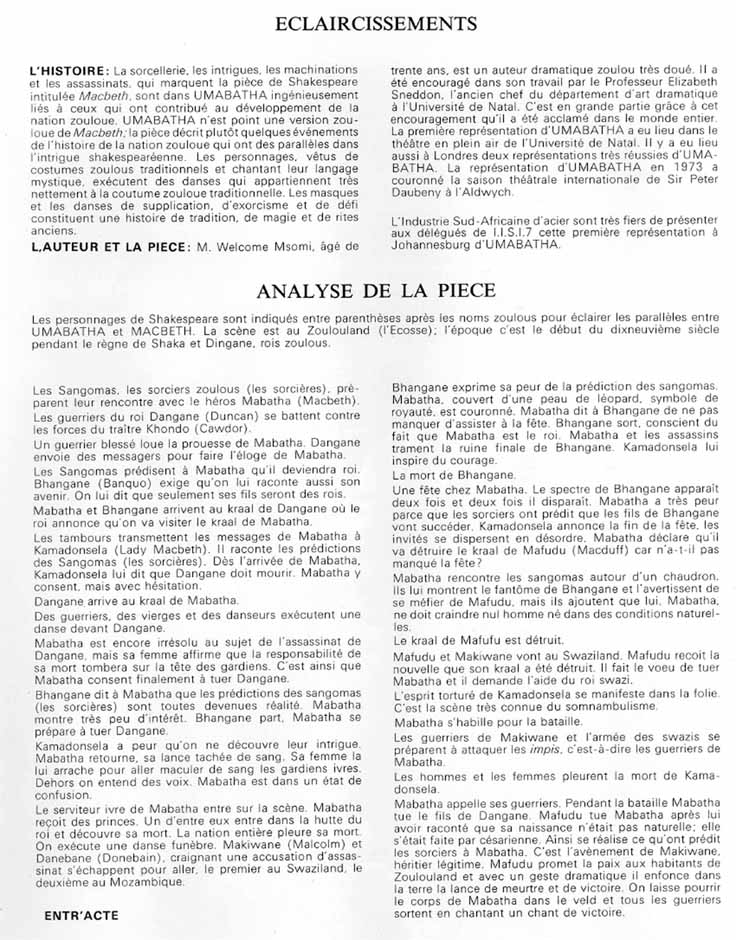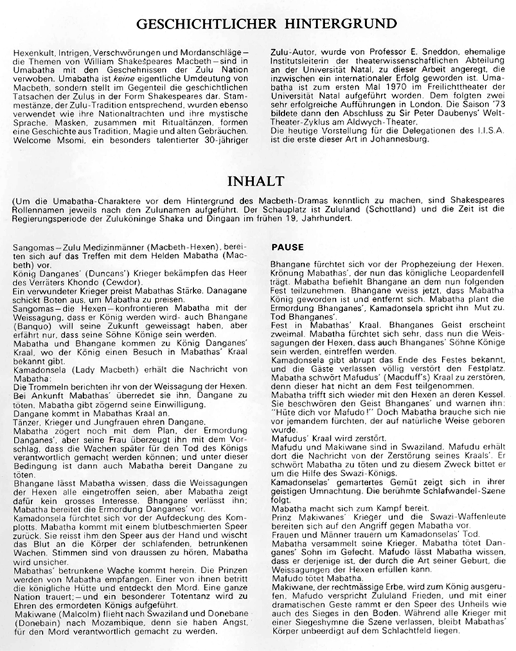 Extract from the catalogue "UMABATHA" which appeared on the occasion of a performance by The Zulu Theatre Company at the Colosseum, Johannesburg, on 8th October, 1973, presented by the SA. Steel Industry to I.I.S.I. 7 delegates